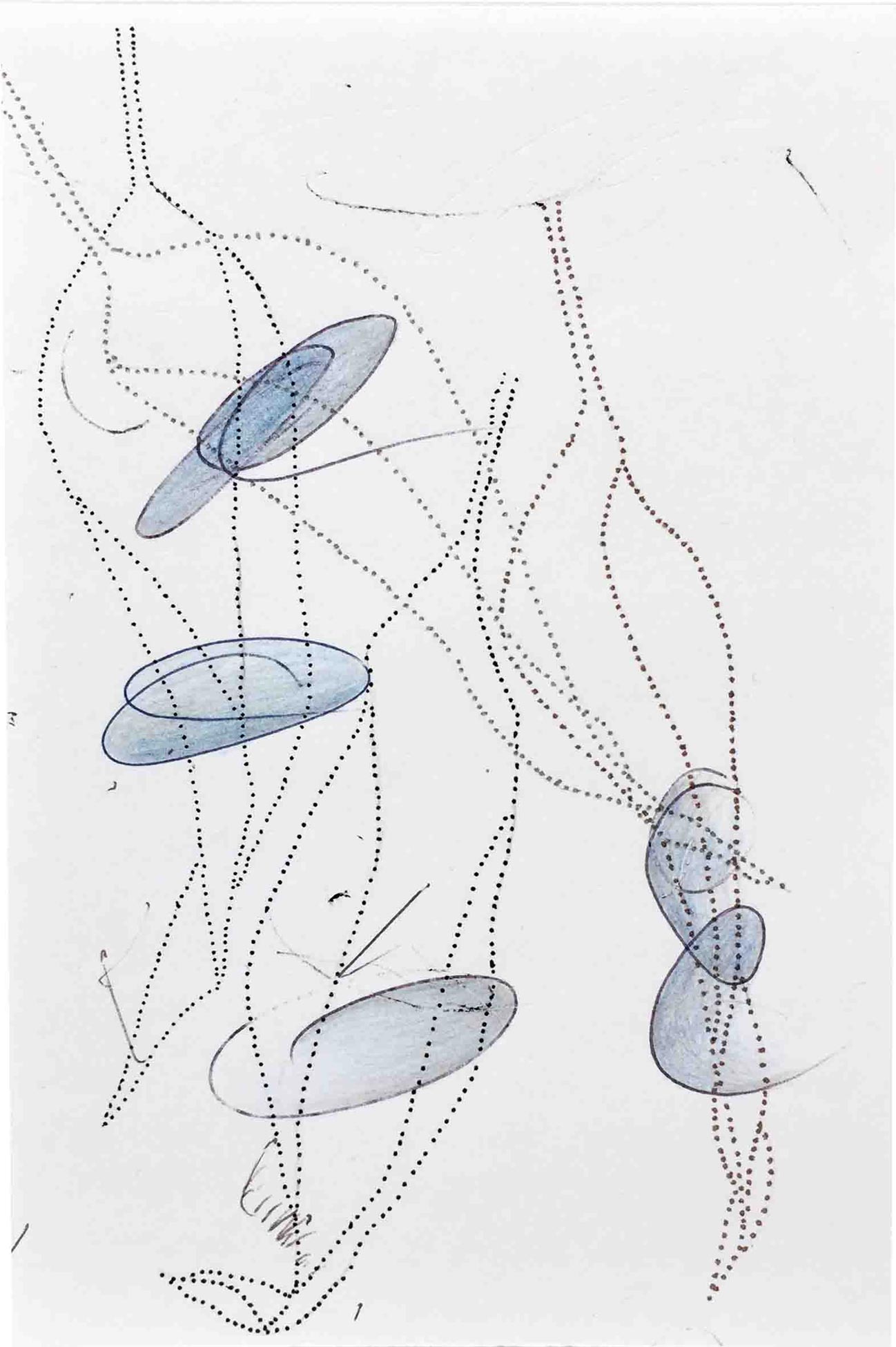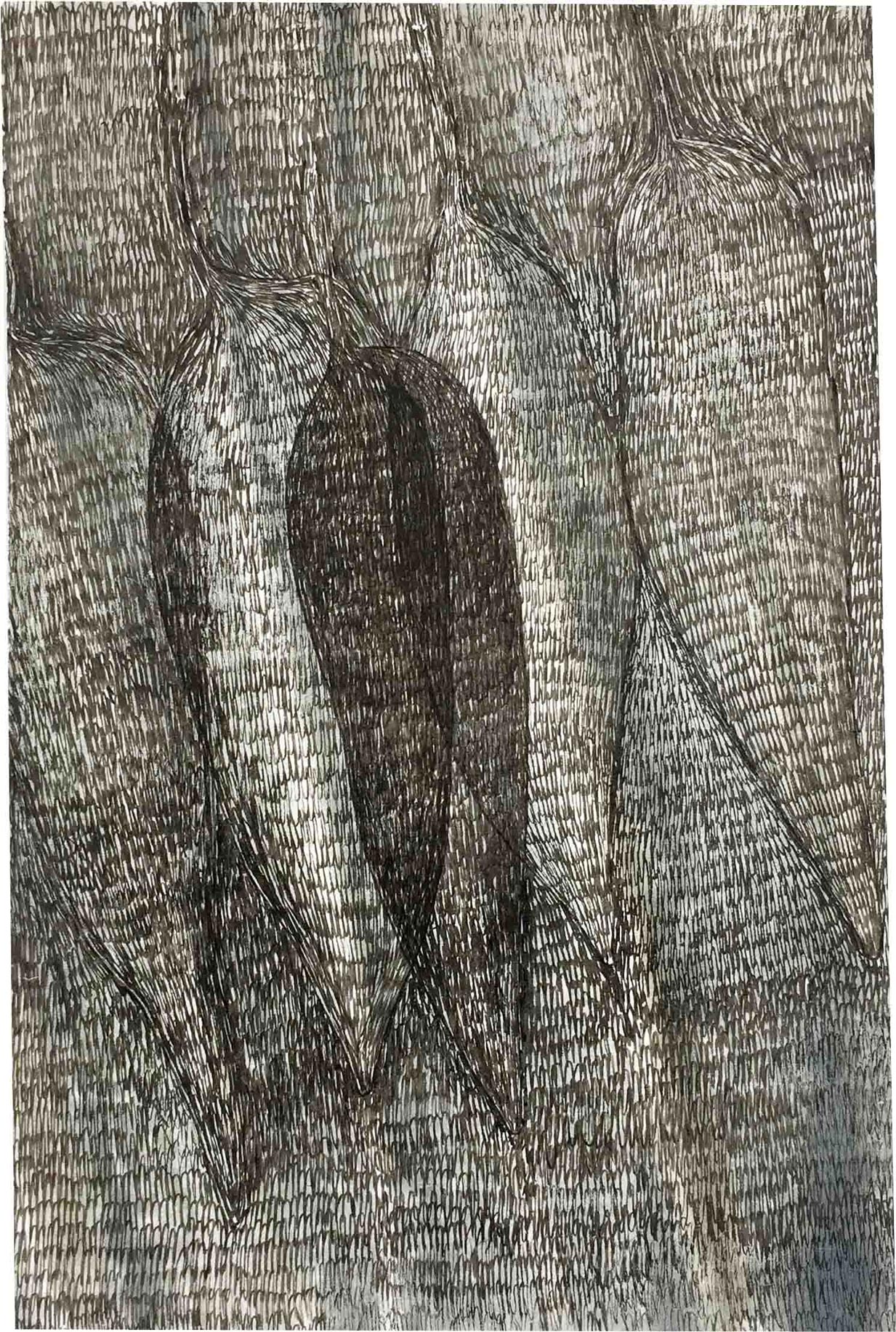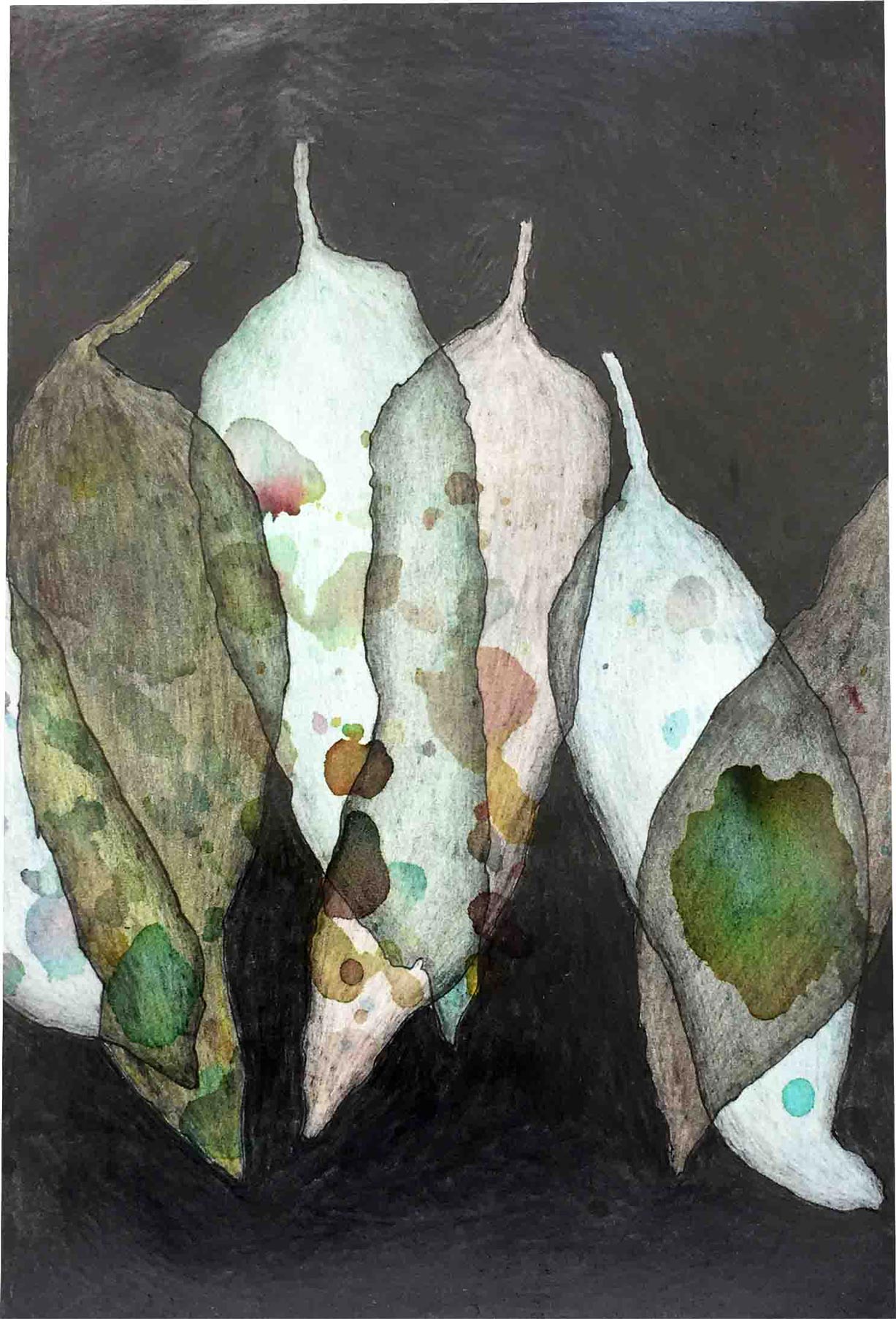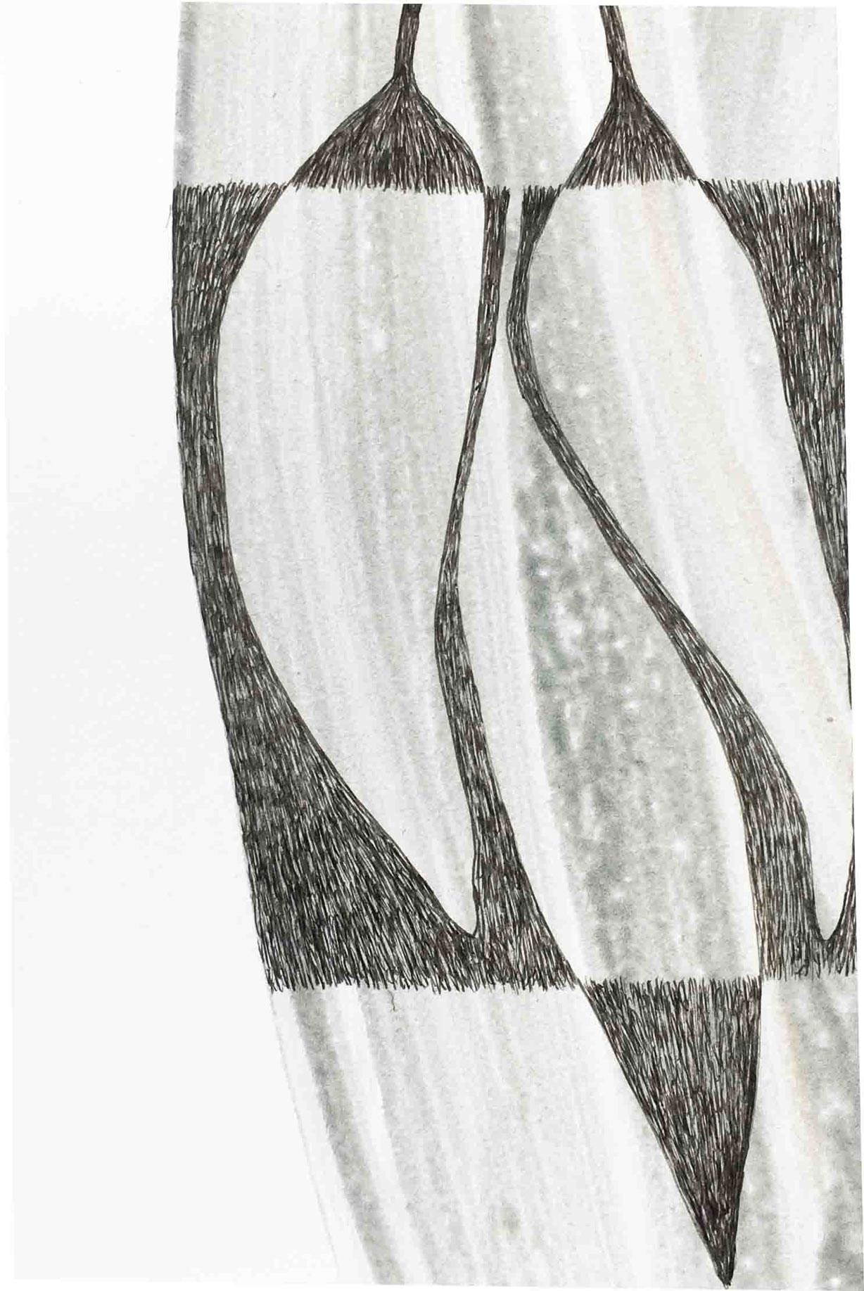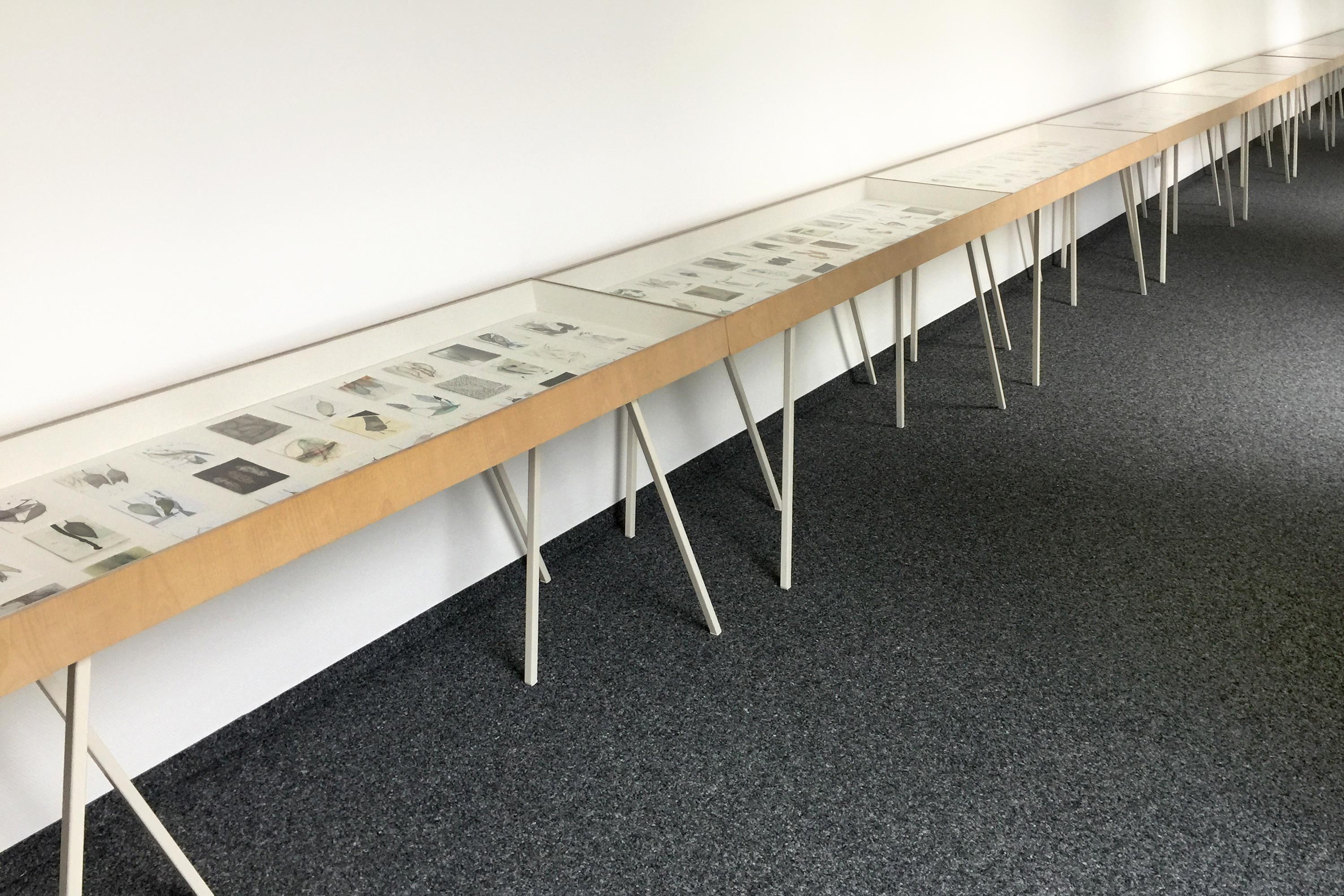 Ausgelegt in Vitrinen laden 400 kleine, intime Zeichnungen zum vergleichenden Blick ein. Die Arbeit »Blätter« entstand im Zeitraum 2017/2018 und wurde in dieser Ausdehnung für die »gang-ART« im Alberhaus, Reutlingen entwickelt. Die Zeichnungen scheinen in ihrer Konzentration wie aus der Zeit gefallen. In der Gesamtschau bündelt sich eine Kraft, die aus der Verschiedenheit untereinander sich nährt.